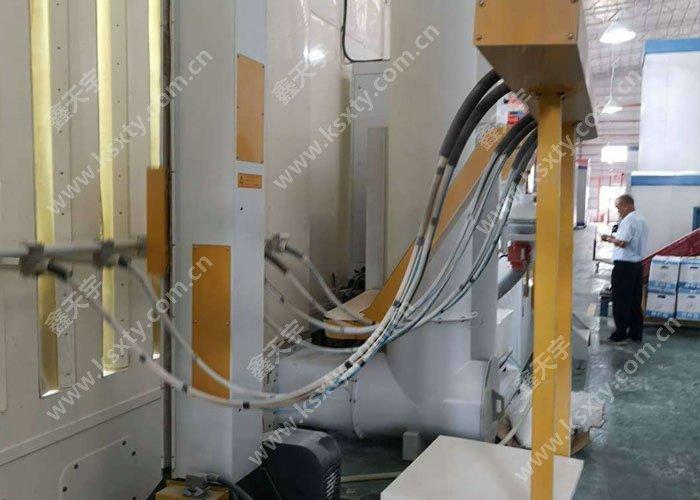 因為被噴工件較為復雜,為方便手噴,特采用世界先進的進出口平臺外手噴形式。能便于手噴人員零距離靠近工件觀察和噴涂工件的難噴角位,手噴操作位置環(huán)境亦更加舒適。噴房手噴口外置后,噴房內(nèi)長縮短,更易于清理。同時考慮到工件的多樣性,特設計粉房底部及頂部各加一把固定槍。