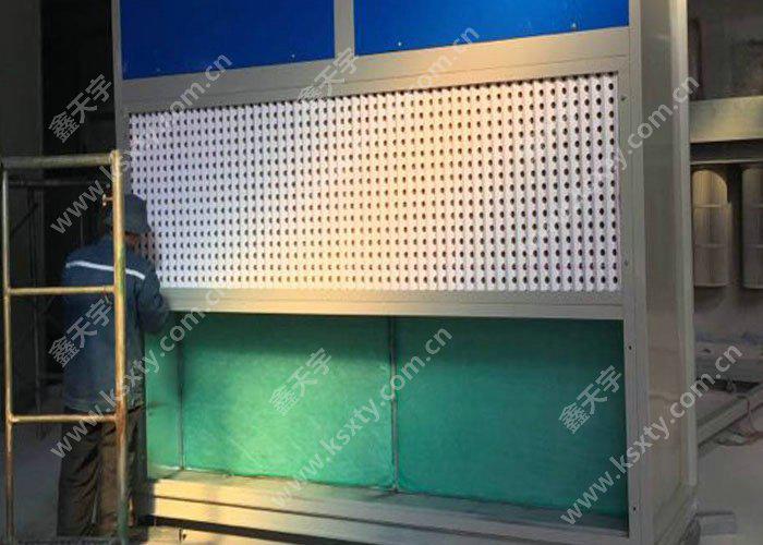 干式噴漆房是一種采用折流板、濾網(wǎng)等干式過(guò)濾器過(guò)濾漆霧的設(shè)備,抽風(fēng)方式為橫向抽風(fēng),一般為死端式或臺(tái)式。在通風(fēng)機(jī)的作用下漆霧進(jìn)入過(guò)濾器被粘附捕集,除去了漆霧的空氣,經(jīng)通風(fēng)管,排至車間之外。
